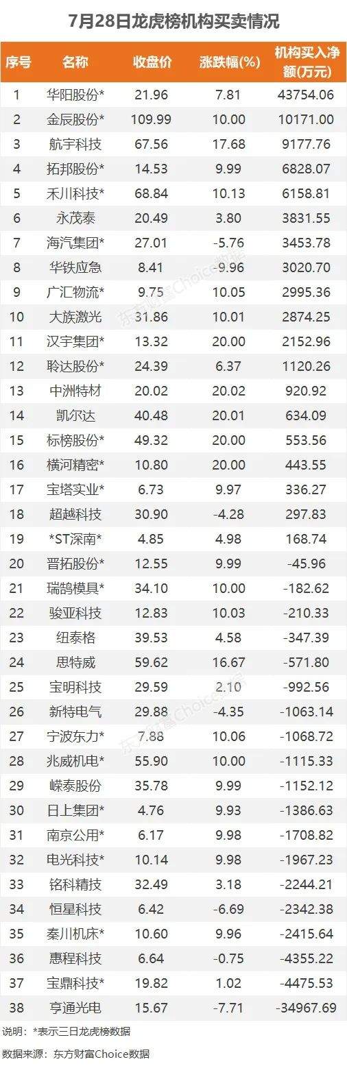 机构参与龙虎榜中个股共涉及38股,其中19股被机构净买入,华阳股份被机构净买入最多,三日净买入4.38亿元。另外19股被机构净卖出,亨通光电被卖出最多,金额为3.5亿元。