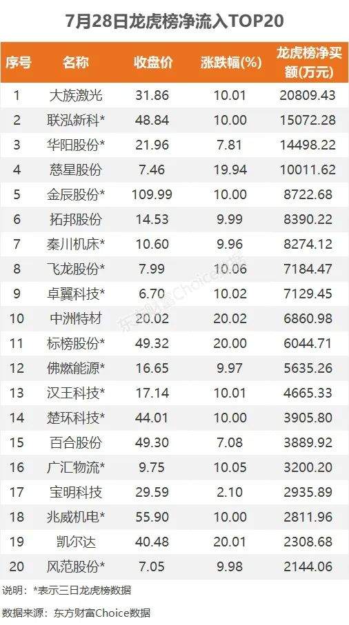 7月28日,上榜龙虎榜个股中,资金净流入最多的是大族激光,为2.08亿元。数据显示,该股日内涨停收盘,全天换手率5.67%,成交额17.38亿元。资金净流入居前的深股通席位净买入1.75亿元,中金上海分公司净买入2574.96万元。