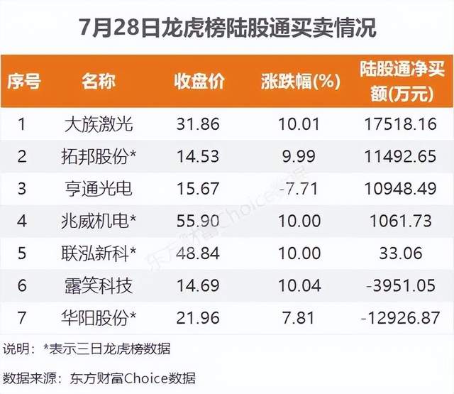 陆股通参与龙虎榜中个股共涉及7股,其中5股被陆股通净买入,除上述大族激光外,拓邦股份也被陆股通买入居前,三日净买入1.15亿元。另外2股被陆股通净卖出,华阳股份被卖出较多,三日净卖出1.29亿元。