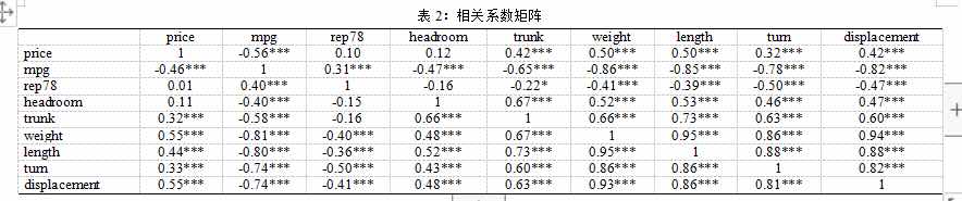 corr2docx price mpg rep78 headroom trunk weight length turn displacement using corr2.docx, replace star(* 0.1 ** 0.05 *** 0.01 ) fmt(%4.2f) title("表2:相关系数矩阵")