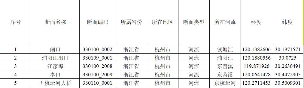 “十三五”浙江省地表水水质国控断面坐标数据,共109个断面,含断面名称、所在流域、所在水体、水体类型、经度、纬度、断面属性、所在省份、所在地市,可分流域和省市),配合早期(2016年1月——2020年12月)全国地表水水质月报或个人研究使用。