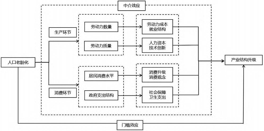 人口主要通过生产环节和消费环节影响经济活动,而产业结构的变动也受到供给和需求两个维度的基本影响。当人口作为劳动者时,具有生产属性,人口老龄化通过劳动力的供给规模和供给质量影响产业结构升级。当人口作为消费者时具有消费属性,人口老龄化通过改变居民消费水平和政府支出结构影响产业结构升级。
