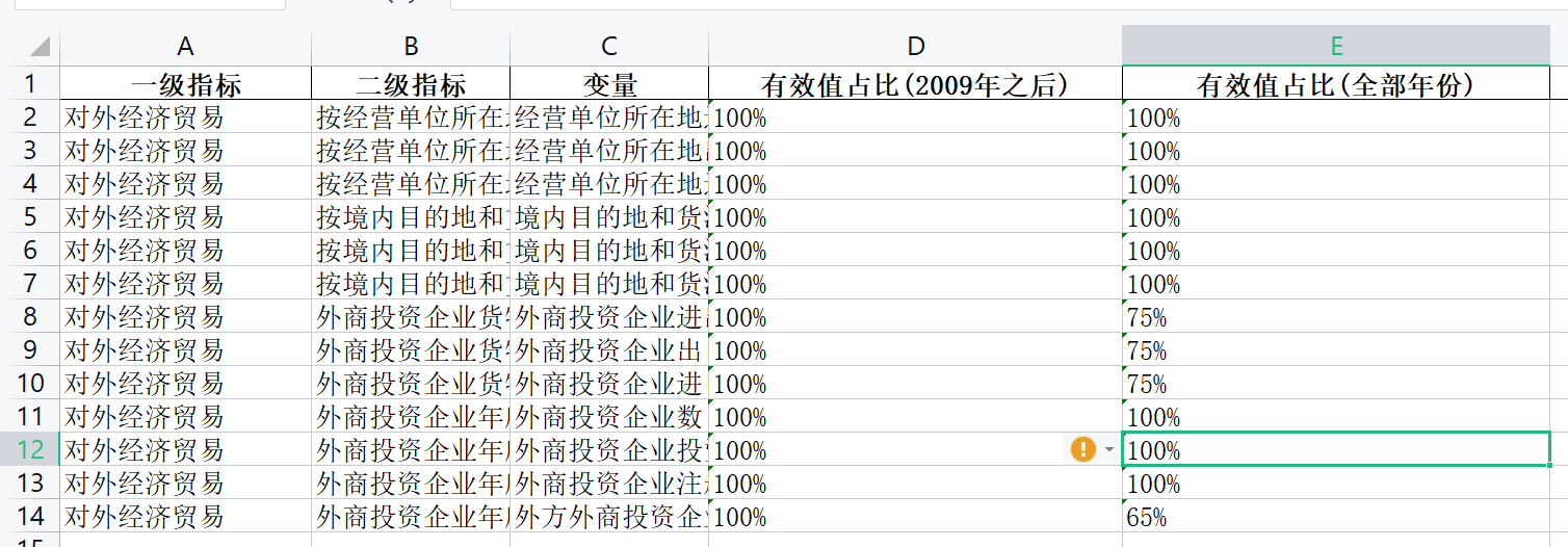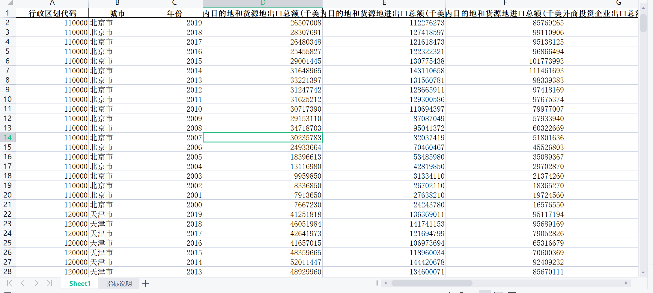 行政区划代码、城市、年份、 境内目的地和货源地出口总额(千美元) 、境内目的地和货源地进出口总额(千美元) 、境内目的地和货源地进口总额(千美元) 、 外商投资企业出口总额(千美元)、外商投资企业投资总额(百万美元) 、外商投资企业数(户) 、外商投资企业注册资本(百万美元) 、外商投资企业进出口总额(千美元)、外商投资企业进口总额(千美元) 、外方外商投资企业注册资本(百万美元)、 经营单位所在地出口总额(千美元) 、经营单位所在地进出口总额(千美元) 、经营单位所在地进口总额(千美元)