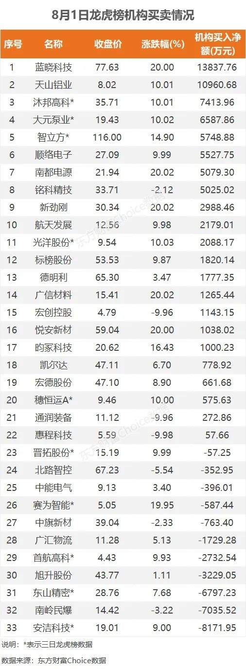 机构参与龙虎榜中个股共涉及33股,其中22股被机构净买入,蓝晓科技被买入最多,为1.38亿元。另外11股被机构净卖出,安洁科技被卖出最多,三日净卖出8171.95万元。
