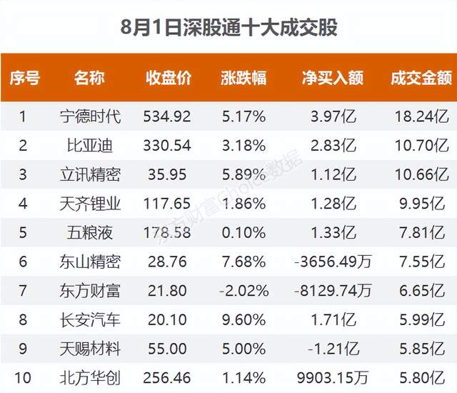 交易所公布的沪深港通十大成交股显示,北上资金大幅净买入宁德时代3.97亿元,净买入比亚迪2.83亿元,净买入华友钴业2.89亿元,同时大幅净卖出贵州茅台1.96亿元。