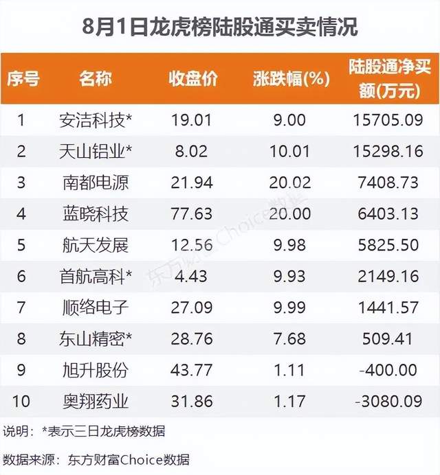 陆股通参与龙虎榜中个股共涉及10股,其中8股被陆股通净买入,除上述安洁科技外,天山铝业也被陆股通买入较多,三日净买入1.53亿元。另外2股被陆股通净卖出,奥翔药业被卖出较多,为3080.09万元。