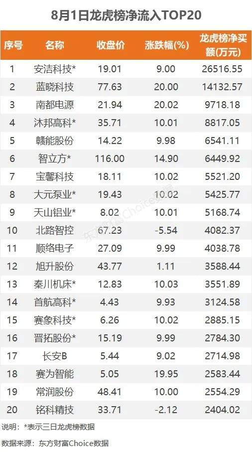 8月1日,上榜龙虎榜个股中,资金净流入最多的是安洁科技,三日净流入2.65亿元。数据显示,该股日内大涨9%,近三日累涨25.07%。资金净流入居前的深股通席位三日净买入1.57亿元,中金上海分公司三日净买入1883.89万元。