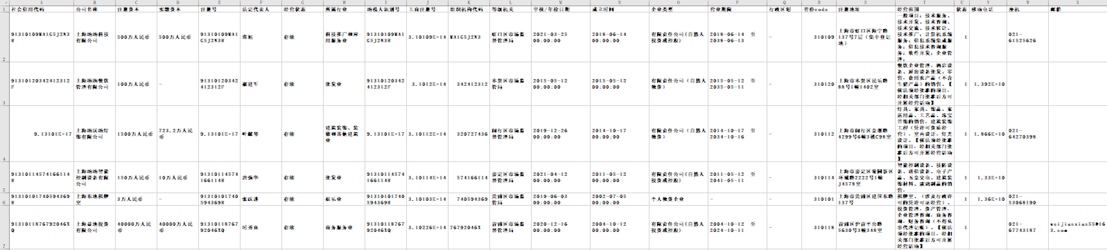 | 社会信用代码 | 公司名称 | 注册资本 | 实缴资本 | 注册号 | 法定代表人 | 经营状态 | 所属行业 | 纳税人识别号 | 工商注册号 | 组织机构代码 | 等级机关 | 审核/年检日期 | 成立时间 | 企业类型 | 营业期限 | 行政区划 | 省份code | 注册地址 | 经营范围 | 状态 | 移动电话 | 座机 | 邮箱 |