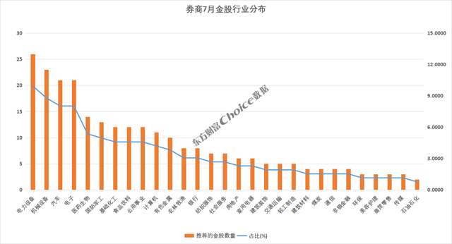 行业方面,券商7月金股中有26只属于电力设备行业,占比9.92%;机械设备行业有23只,占比8.78%;汽车、电子行业均有21只。