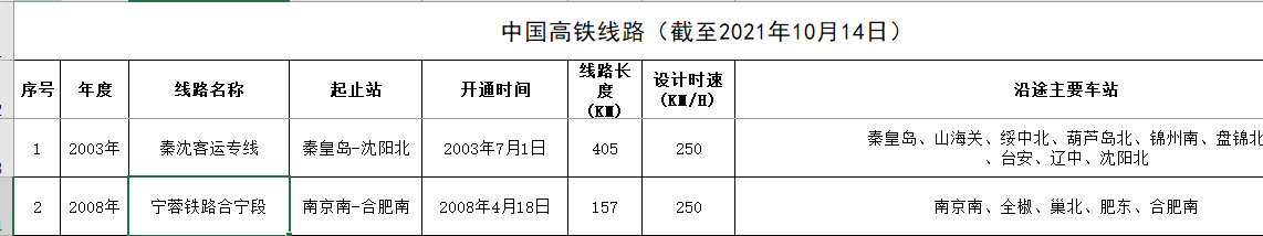 (1)高铁线路开通相关数据(不同于常见的使用全国列车时刻表收集的方法)——使用爬虫软件,从中国动车组网(首页-记录动车组列车发展历程——慧伊创新科技(北京)有限公司 (china-emu.cn))爬取我国高速客运专线线路相关信息。包括已开通线路属性信息+站点及站点开通时间(站点数据中已手动剔除未开通站点)。