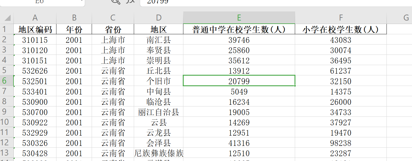 指标包括:普通中学在校学生数(人)、小学在校学生数(人)