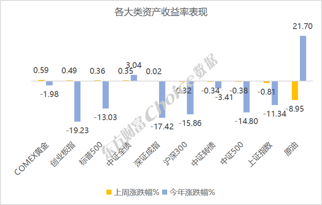 大类资产方面,上周市场指数涨跌互现,黄金、创业板分别上涨0.59%、0.49%,原油大跌8.95%;上证指数下跌0.81%。
