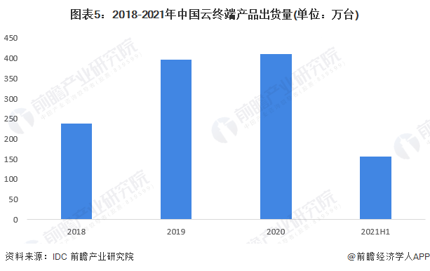 桌面云的不断应用也带动了云终端产品市场的繁荣。2020年在疫情的影响下,我国云终端市场再次迎来大幅提升,根据IDC发布的中国云终端市场季度跟踪报告数据显示,2020年中国云终端市场出货量为410.3万台。