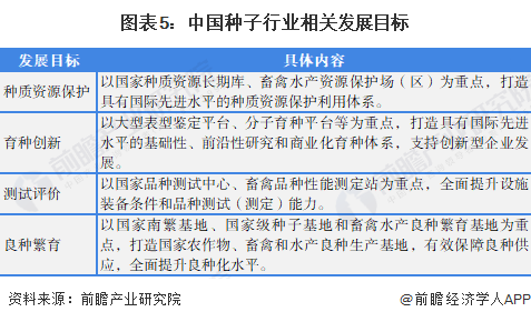 “八五”计划(1991-1995年)至“九五”计划(1996-2000年)时期,主要发展目标为充分利用农村丰富的劳动力资源,向农业的广度和深度进军;“十五”计划(2001-2005年)时期发展目标为通过实施“种子工程”、完善农田水利配套设施、加强中低产田改造、调整商品粮基地建设的内容和布局等措施,稳定粮食生产能力;“十一五”计划(2006年-2010年)提出建立和完善优异种质创新、新品种培育和规模化制种三大技术平台;“十二五”规划(2011-2015年)时期,主要发展目标为加快农业生物育种创新和推广应用;“十三五”规划(2016-2020年)提出,在加快生物育种发展目标的基础上,培育壮大育繁推一体化的种业龙头企业。《“十四五”规划和2035年远景目标纲要》提出确保种源安全、有序推进生物育种产业化应用、培育具有国际竞争力的种业龙头企业的发展目标。