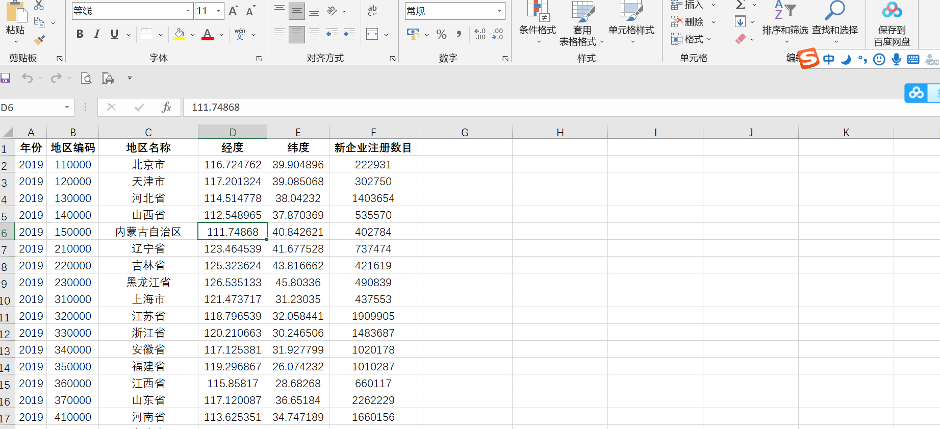 年份、地区编码、地区名称、新企业注册数目、经度、纬度等