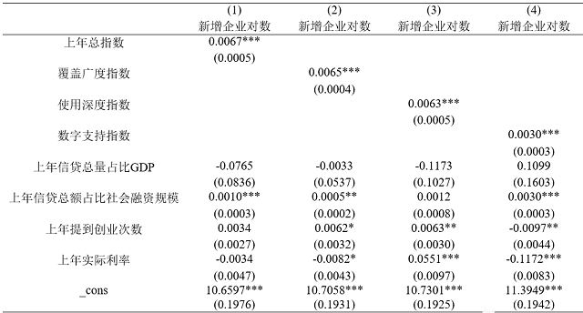 对来自经济学(季刊)《数字金融能促进创业吗?——来自中国的证据》一文中的基准回归部分进行复刻。文章将北京大学数字普惠金融指数省一级数据与用来度量地区创业活跃度的新增企业注册信息相匹配,研究了数字金融的发展和推广与企业创业之间的关系。