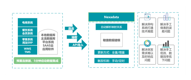 下秒数据Nexadata产品支持通过无代码的数据集成与数据建模技术,帮助企业将所有应用程序、数据库、事件和文件等数据信息提取到数据仓库中,并快速将分散的数据转化为数据集、API、自动化流程等开箱即用的数据服务,进而打破企业的数据孤岛问题。