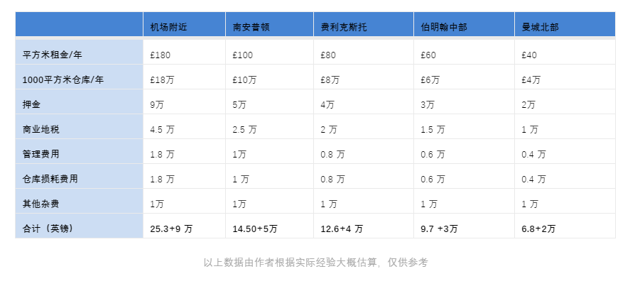租金:英国的租金一般是按平方英尺来计算(1 平方米大概是10.76 平方英尺,为了方便计算,这里假设1平方米是10平方英尺)。以英国几个热门建仓地址为例,分别粗略计算了他们的单位租金成本: