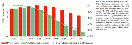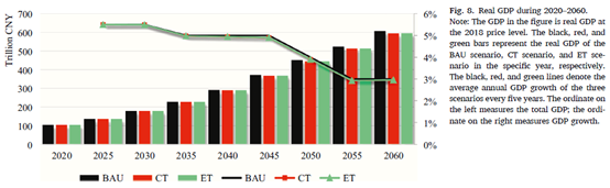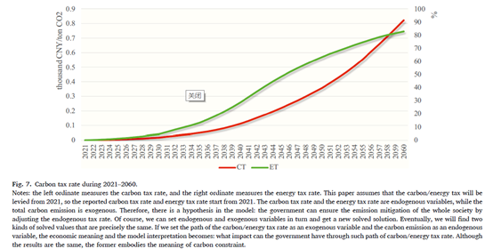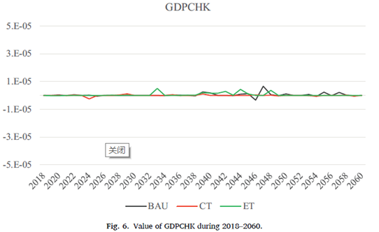 5.1.能源资源税与碳税的比较本文假设政府在不同情景下具有共同的减排目标。政府可以不同的方式实现它,一种是通过碳税,另一种是通过能源税。5.2.情景假设设置了三种情景:基准情景(BAU)、碳约束下的碳税(CT)和碳约束下的能源(ET)。在 BAU 情景中,假设没有碳约束,并且可再生能源具有化石能源自然替代过程。在这样的情景下,假设2036年左右达到碳峰值,然后碳排放量将缓慢下降,到2060年碳排放量为8.49万亿吨。在CT情景下,假设中国将在2021年及以后开征化石能源碳排放税。在ET情景中,2021年至2060年期间对所有能源用户征收从价能源税。具体碳排放路径如图4所示。
