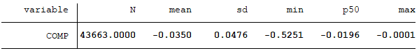 需要指出的是,用季度数据计算仅能得到公司i和公司j之间的可比性值,而公式(8)能得到公司i和同行业内其他所有公司之间的可比性值(也称为公司i的公司层面可比性值),因为公式(7)是采用同行业内其他公司的平均会计转换函数来计算预期盈余。