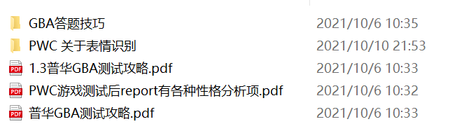 本人由于大一参加PWC职场创想营获奖,直接获得大三寒假实习机会,入职前需要填写材料和GBA测试(类似玩游戏),分享当时用的资料,内容如图1,文件夹1和2的内容在图2和3,另有四大资料和填笔试时的OQ问题可供参考