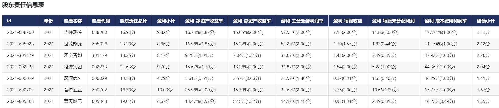三级指标:净资产收益率、总资产收益率、主营业务利润率、成本费用利润率、每股收益、每股未分配利润、速动比率、流动比率、现金比率、股东权益比率、资产负债率、分红融资比、股息率、分红占可分配利润比、交易所对公司和相关责任人处罚次数、产品开发支出、技术创新理念、技术创新项目数、职工人均收入、员工培训、安全检查、安全培训、慰问意识、慰问人、慰问金、质量管理体系证书、客户满意度调查、供应商公平竞争、反商业贿赂培训、环保意识、环境管理体系认证、环保投入金额、排污种类数、节约能源种类数、所得税占利润总额比、公益捐赠金额。