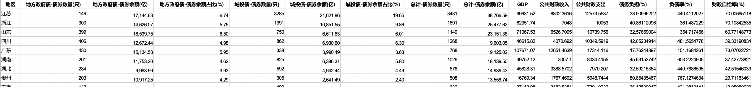 地区 | 地方政府债-债券数量(只) | 地方政府债-债券余额(亿) | 地方政府债-债券余额占比(%) | 城投债-债券数量(只) | 城投债-债券余额(亿) |