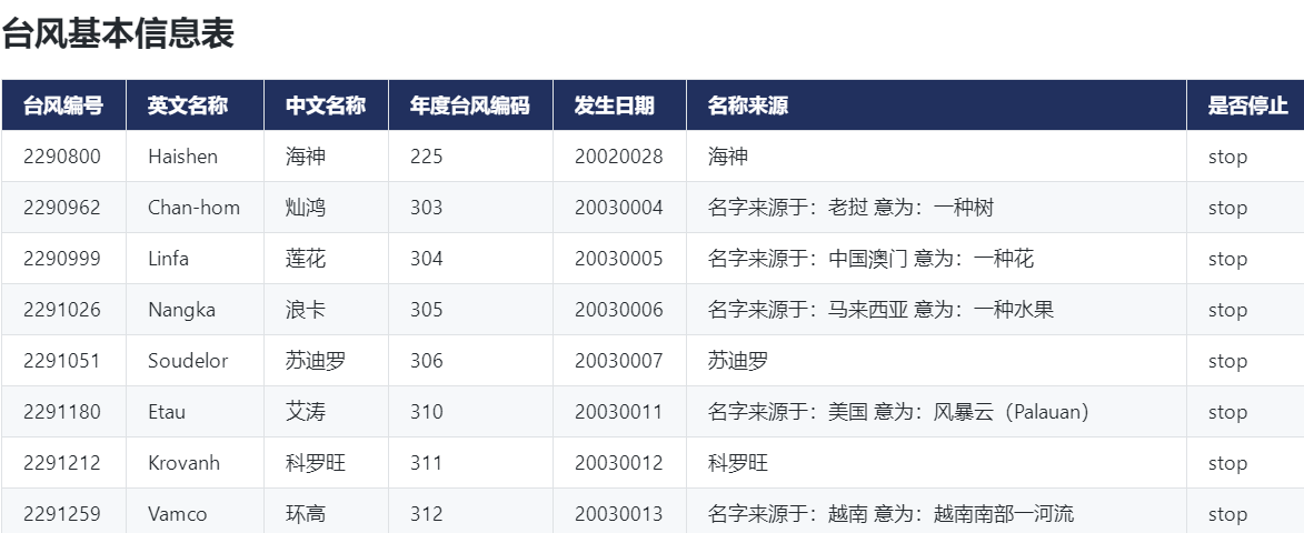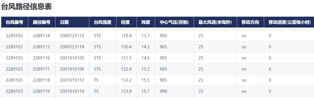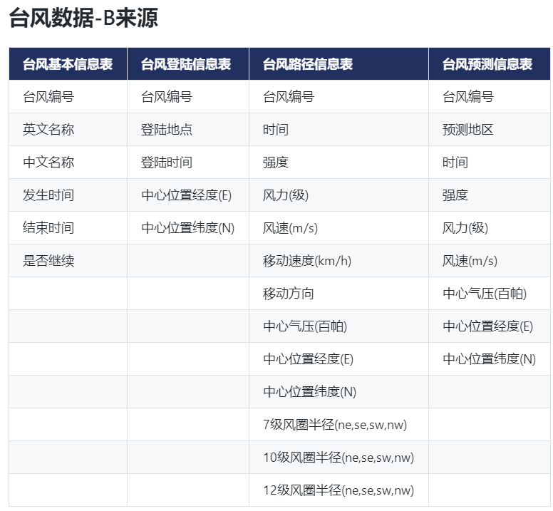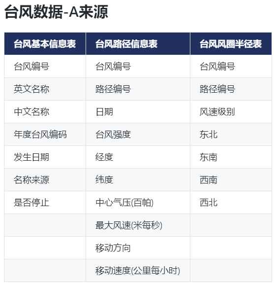 台风数据库,共包含来自两个来源的台风信息,各来源在字段、数据量方面均有不同,此二来源全面、完整地涵盖了我国东南沿海至西太平洋的台风相关信息。