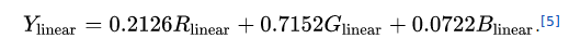 这种亮度计算方法已编入标准 ITU-R BT.601 Studio 编码参数中,用于标准 4:3 和宽屏幕 16:9 纵横比。 顺便说一句,它在 1983 年获得了艾美奖。