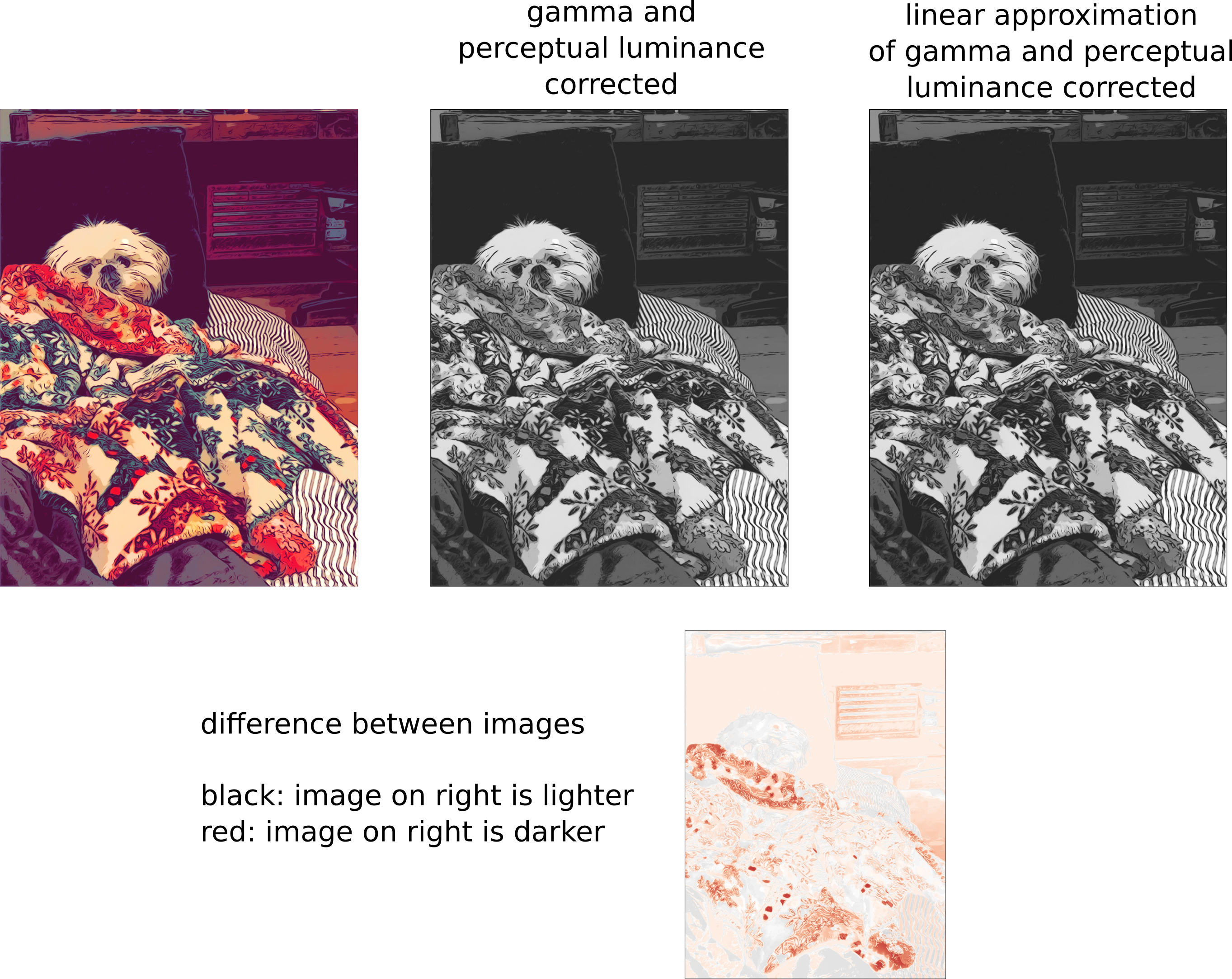 考虑到伽马压缩后,整个图像都会变亮。它使亮度与原始图像的亮度更接近。最后,我们有一个高质量的灰度表示。