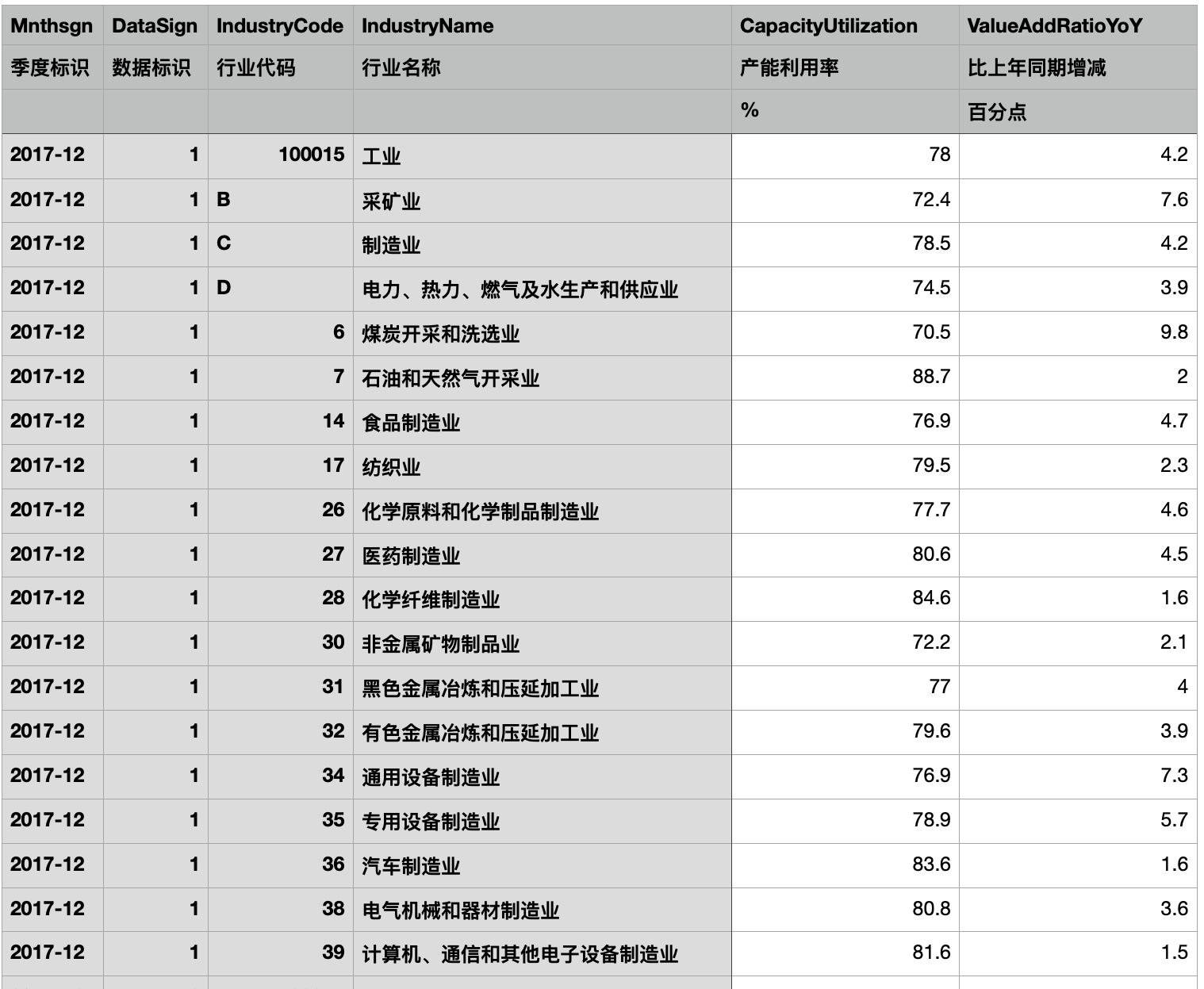 | Mnthsgn | DataSign | IndustryCode | IndustryName | CapacityUtilization | ValueAddRatioYoY |
