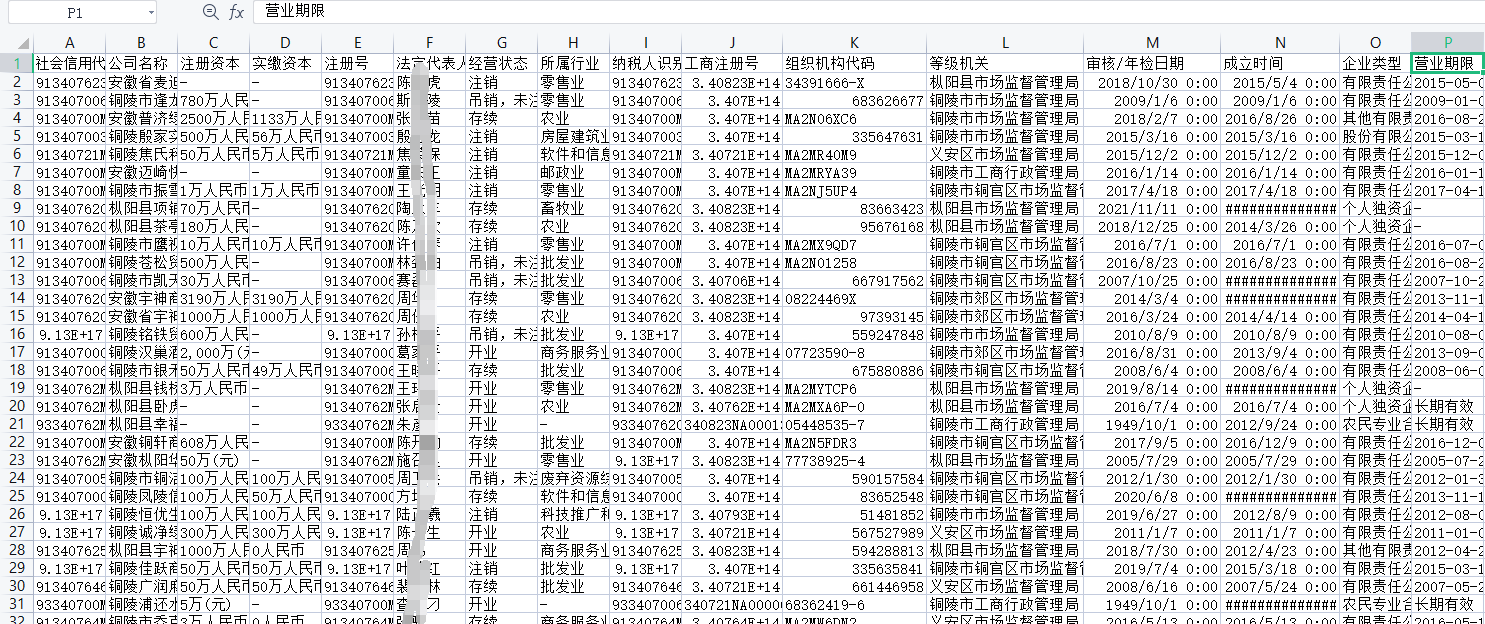 社会信用代码 公司名称 注册资本 实缴资本 注册号 法定代表人 经营状态 所属行业 纳税人识别号 工商注册号 组织机构代码 等级机关 审核/年检日期 成立时间 企业类型 营业期限 行政区划 省份code 注册地址 经营范围 状态 移动电话 座机电话 邮箱