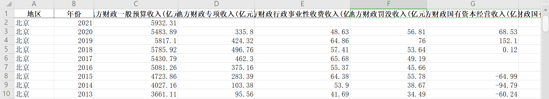 注:地方财政一般预算收入到2021年、其他均到2020年,且地方财政罚没收入(亿元) 地方财政国有资本经营收入(亿元) 地方财政国有资源(资产)有偿使用收入(亿元) 地方财政其他非税收入(亿元)这几个指标2007年数据没有