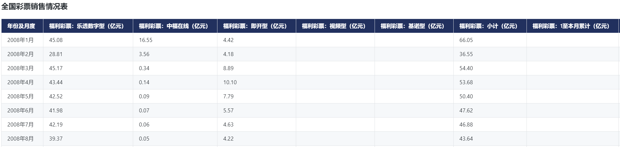 全国彩票销售情况表:2008.01-2022.01