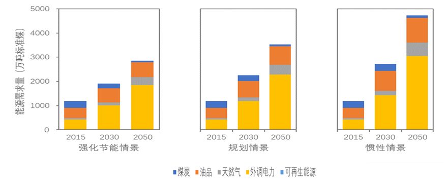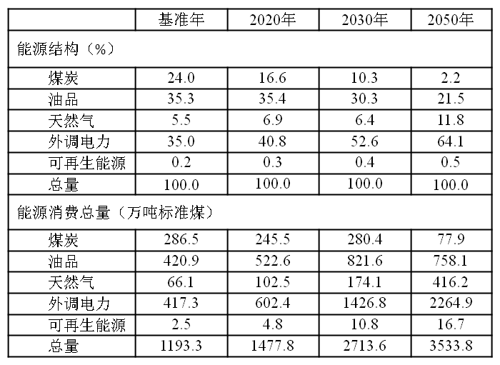 从不同能源品种角度来看,外调电力和油品所占比重最高,且增长速度较快,在规划情景中,两种能源至2050年分别达到2264.9万吨标准煤和758.1万吨标准煤,分别占64.1%和21.5%。工业电气化对电力增长的贡献最大,其次是家庭部门和服务业部门;而油品需求量快速增长的主要原因是交通出行需求的增长。天然气的使用量也将持续增长,2050年天然气需求量为416.2万吨标准煤,占比11.8%。而煤炭的使用量则持续下降,远景2050年需求量为77.9万吨标准煤,占比仅为2.2%(表4)。