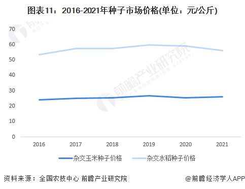 从价格上来看,根据全国农技中心《2020-2021年全国重要农作物种子产供需形势分析》,2016-2021年,种子价格呈平稳态势。2021年,杂交玉米种子价格与水稻种子价格分别达56.1元/公斤与26.01元/公斤。