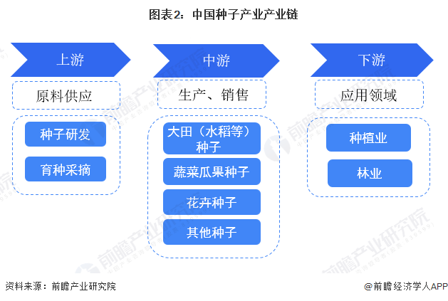 种子行业上游为种子研发、育种采摘环节,中游为制种、销售环节,主要种类包括大田(水稻等)种子、蔬菜瓜果种子、花卉种子等。下游应用领域包括种植业、林业等。