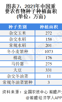 根据《2020-2021年全国重要农作物种子产供需形势分析》,2021年,全国杂交玉米制种面积272万亩;全国杂交水稻制种面积158万亩;常规稻繁种201万亩;冬小麦繁种收获面积1073万亩;棉花繁种面积176万亩;马铃薯繁种面积275万亩;大豆繁种面积331万亩;杂交冬油菜制种收获面积11.27万亩;常规冬油菜繁种收获面积3.05万亩。