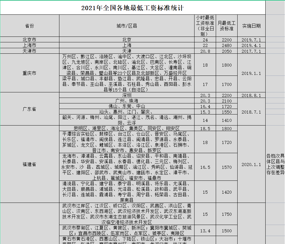 每个省份最低工资标准、每个城市最低工资标准