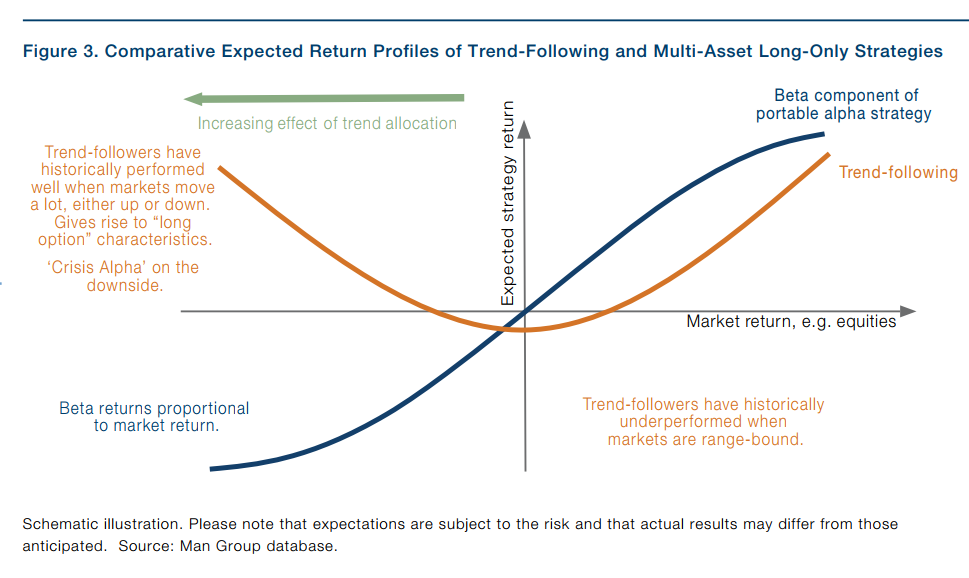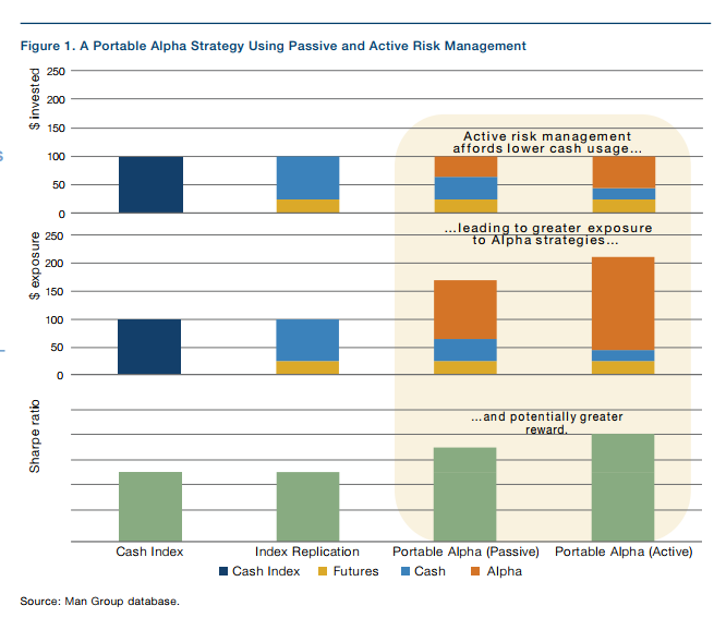 在可携阿尔法策略中,投资者最常见的情况是向对冲基金分配现金,然后使用股票和债券期货来复制他们的战略配置。通过使用期货,投资组合保持其核心配置,同时释放现金以通过对冲基金投资寻求阿尔法。