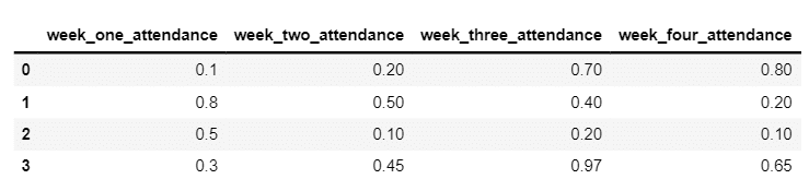 在深入研究场景之前,让我们导入 pandas 库并创建一个名为 df 的数据框,其中包含以下列名称: