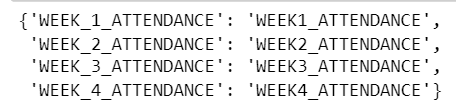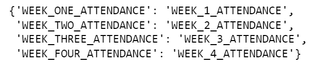 然后,我们将使用for 循环 遍历 Data Frame 的所有列,其中在每次迭代中,第一次出现的下划线将被无空格替换。在每次迭代中,原始列名和新列名将作为键值对添加到字典中。