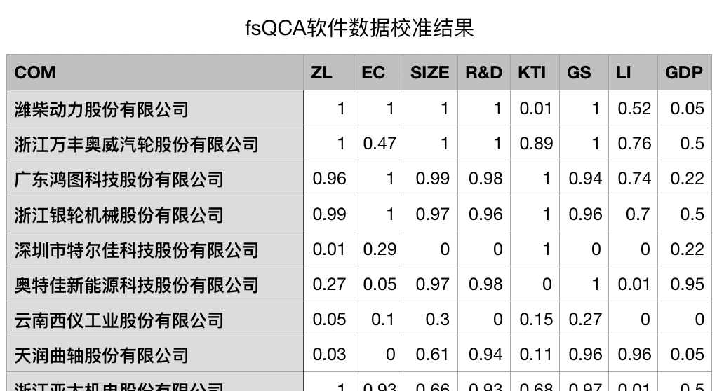fsQCA软件校准结果表为.csv文件,fsQCA软件的运行要求表格文件必须保存为.csv形式。软件校准过程:首先计算各变量的校准锚点,然后通过fsQCA软件数据校准并将其转换为相应的模糊集隶属度。