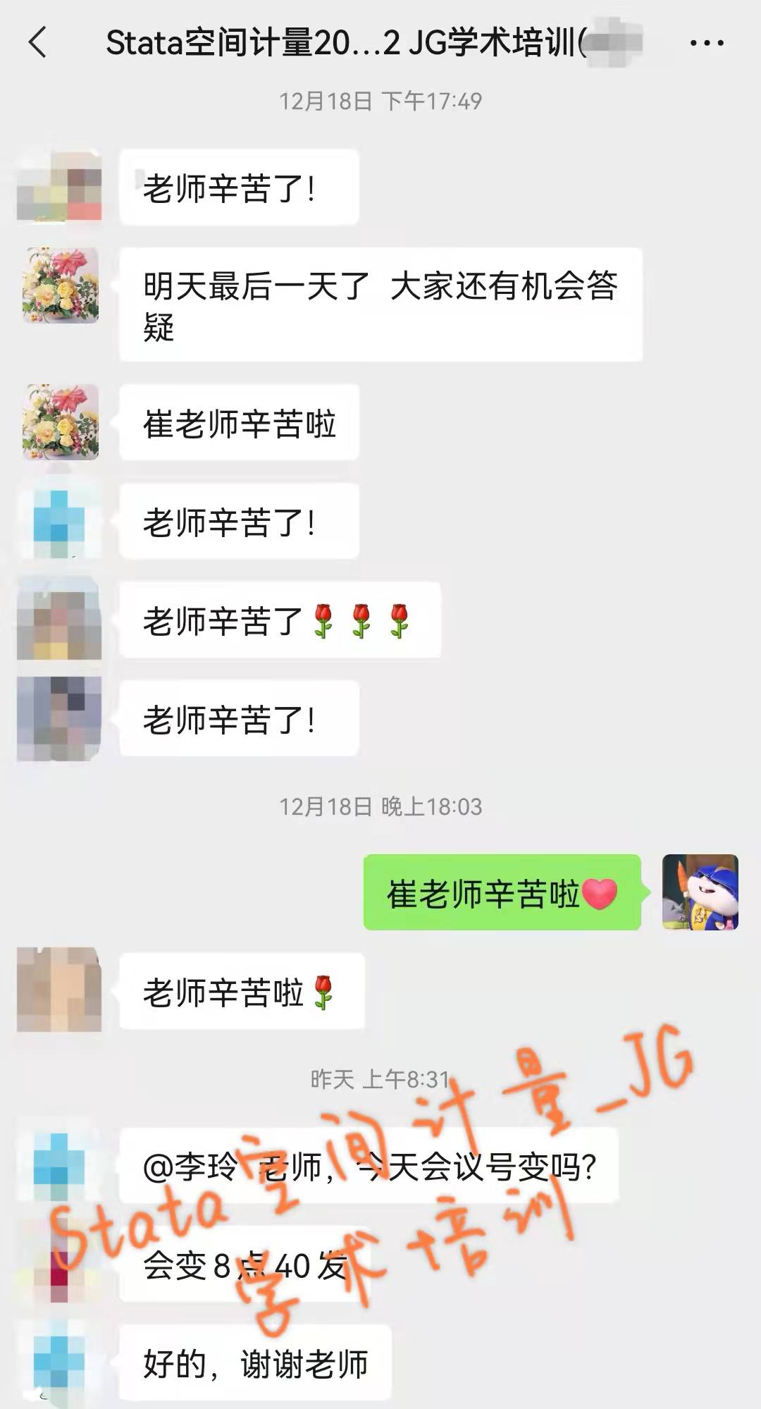 JG学术培训联合空间计量金牌讲师崔百胜自2018年开始,进行了17场Stata空间计量课程,得到老师和同学的肯定,
