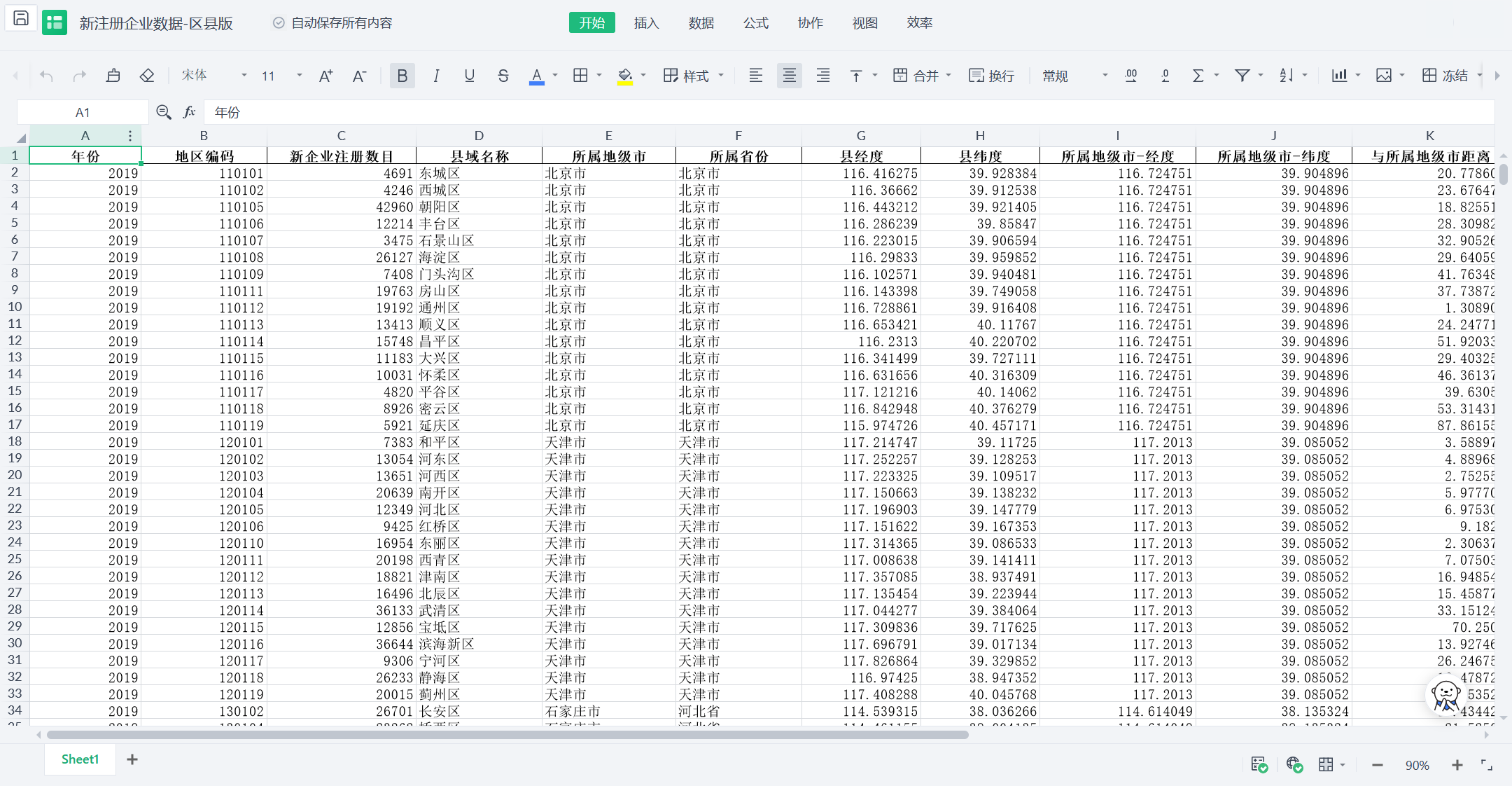 三、数据内容:包含的数据指标(经度、纬度、年份、地区编码、地区名称、新企业注册数目、区县到省会城市、所属地级市的距离等)及内容见下图