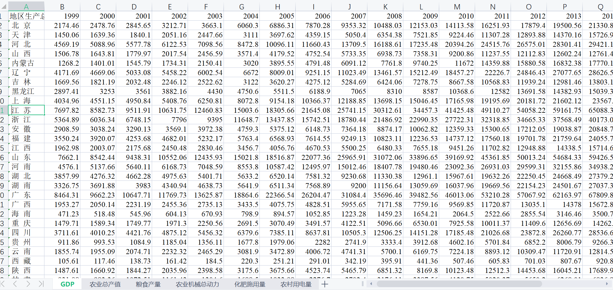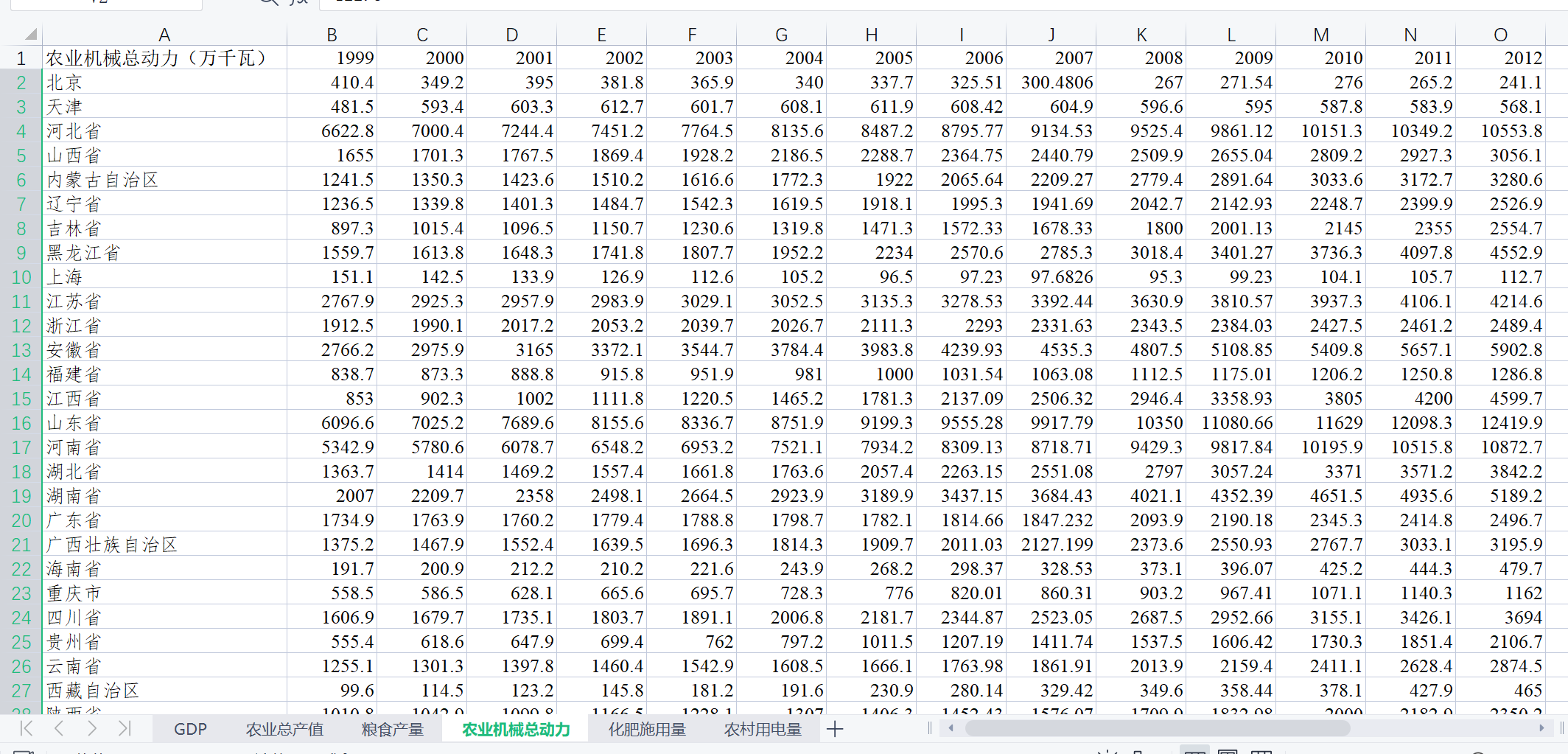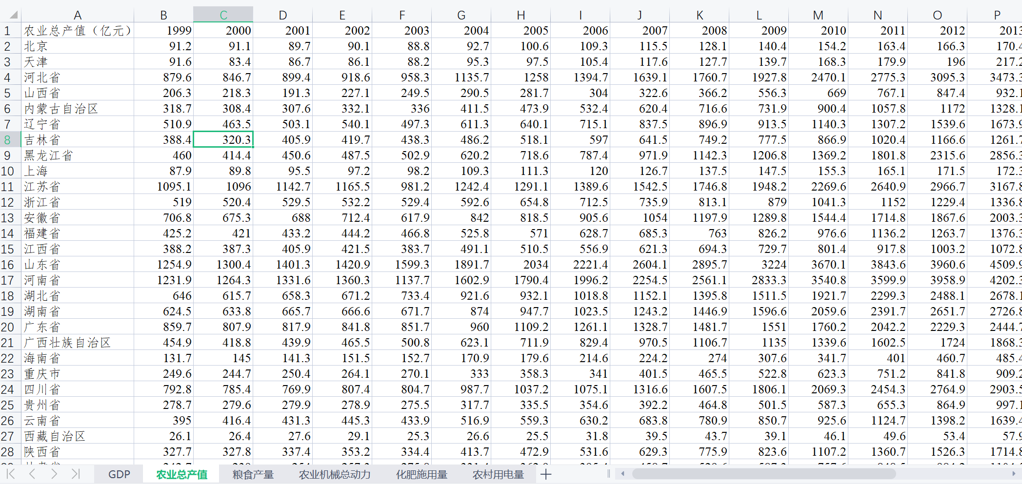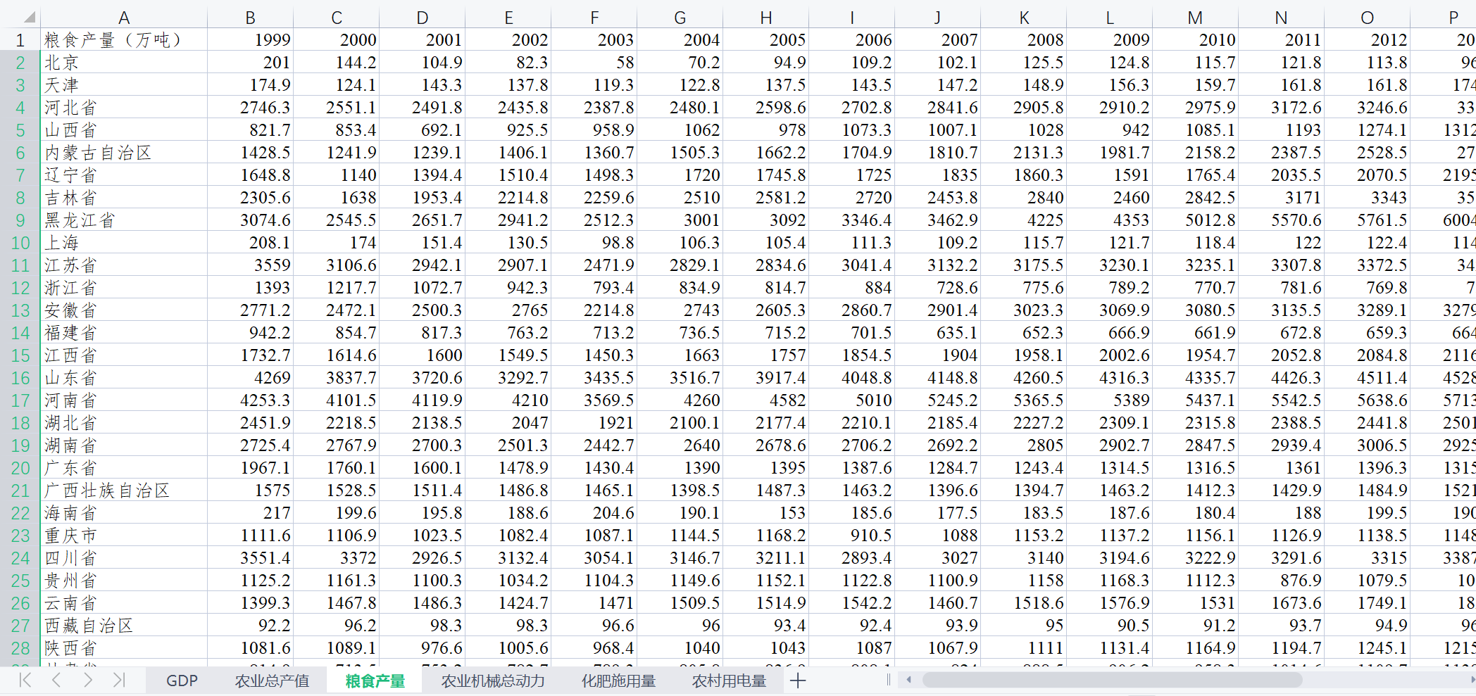 GDP、农业总产值、粮食产量、农业机械总动力、化肥施用量、农村用电量
