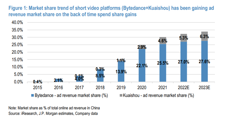 [backcolor=rgba(97, 155, 139, 0.09)]由于中国的在线广告渗透率已达到较高水平,我们认为大多数大型平台的用户群可能会出现个位数的增长。未来的市场份额趋势可能会受到用户时间花费、留存率、参与度和转化率 (ROI) 变化的驱动。我们对短视频作为一种媒体格式的结构性增长持乐观态度,随着短视频继续提高货币化水平,预计广告收入份额将从2021年的20%增长到2023年的 25%以上(c30% 的时间花费份额)(快手广告负载为 7%)和内部电子商务,将用例扩展到本地服务(抖音)等。