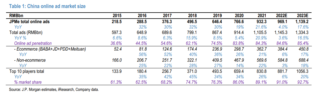 随着中国在线广告市场的在线渗透率接近高位(JPMe2021年为84%),我们认为市场结构已经成熟。这表示: