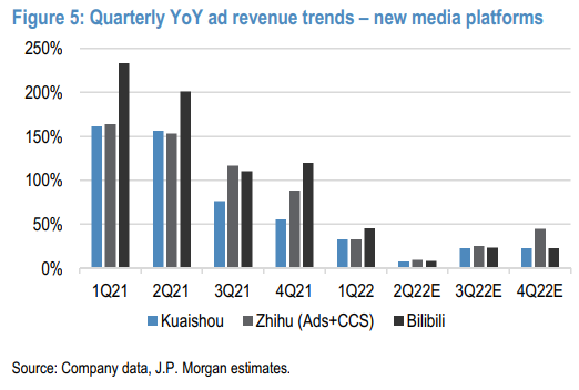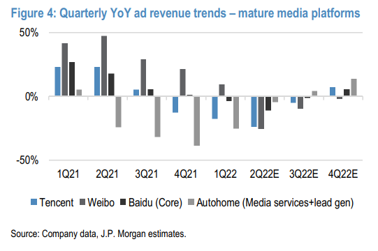 [backcolor=rgba(97, 155, 139, 0.09)]新媒体平台(即快手、哔哩哔哩、知乎)从第三季度开始可能会恢复两位数的增长,因为货币化空间很大。汽车之家是一个例外,其跌幅自22年1季度开始收窄,并可能从3季度起恢复至同比正增长,因为它与 OEM 的发布周期更相关。