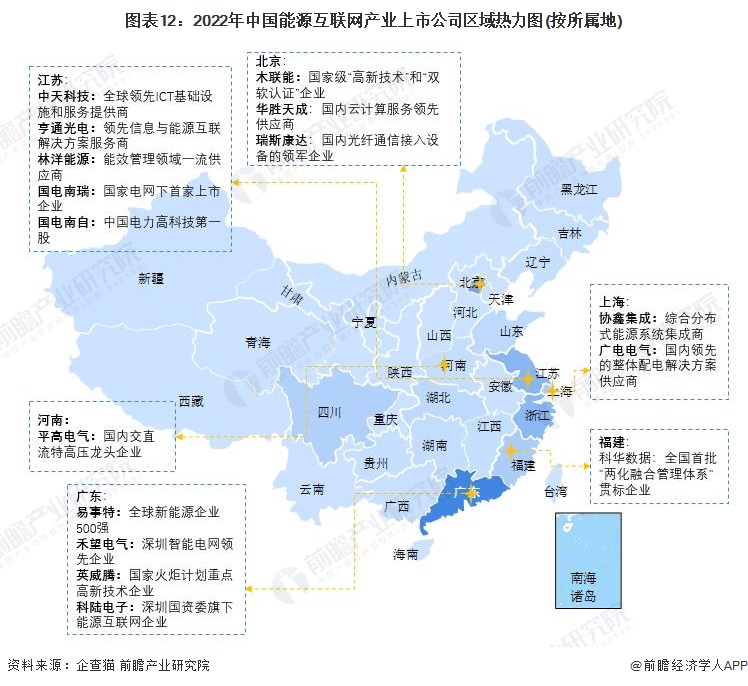 从上市公司的区域分布来看,我国能源互联网相关企业主要集中在广东、江苏、浙江、上海等地区。其中,广东易事特(300376)、科陆电子(002121)等企业是能源互联网行业领先企业;江苏省的国电南瑞(600406)、国电南自(600268)综合性企业为行业龙头。